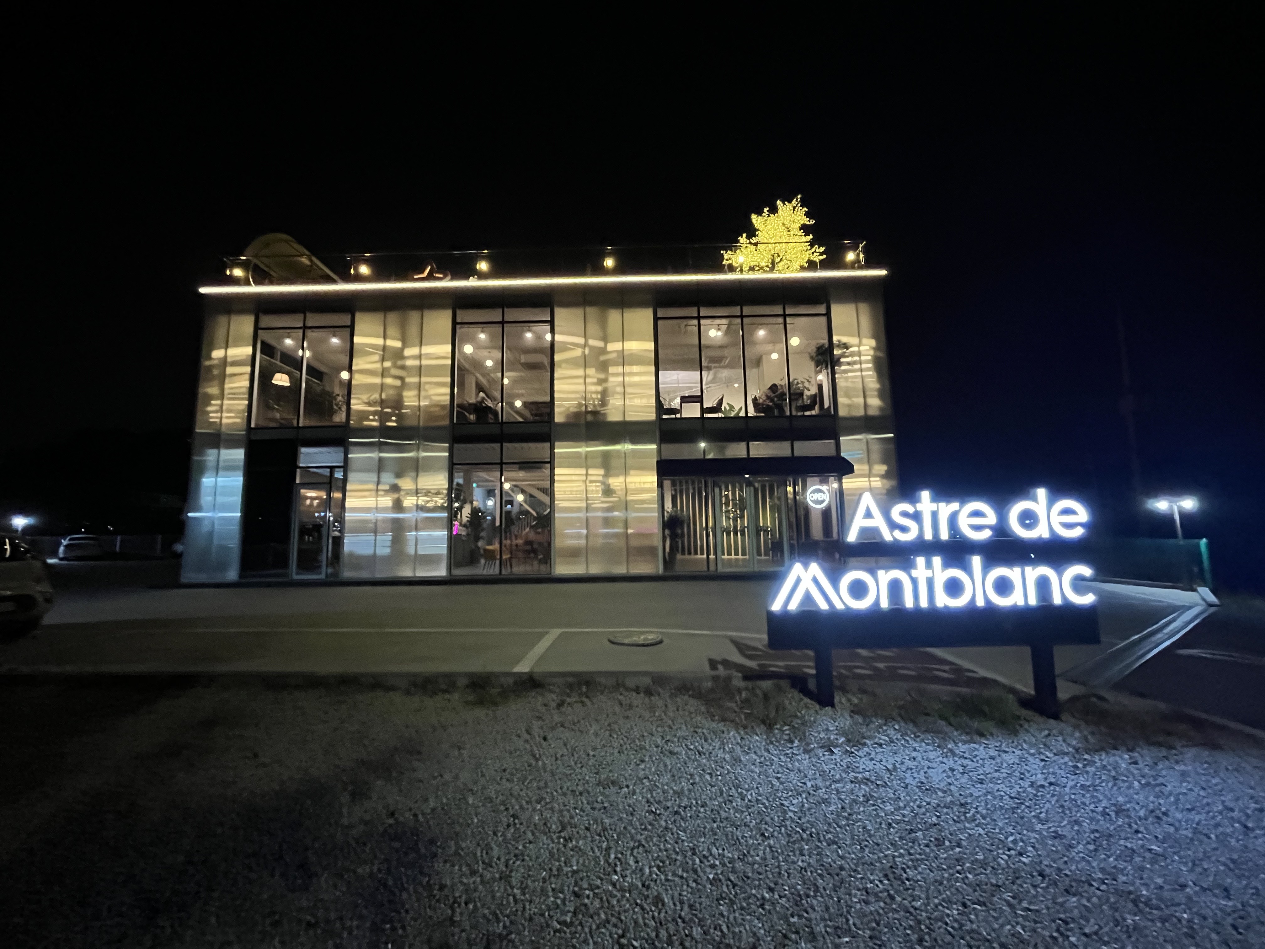 주차장은 매장 뒷켠에 마련돼 있었는데요. 어두컴컴한 곳에 화려한 불빛이 켜져 있는 아스터드몽블랑 매장은 과연 어떻게 꾸며져 있을까요. 한번 문을 열고 들어가보겠습니다.